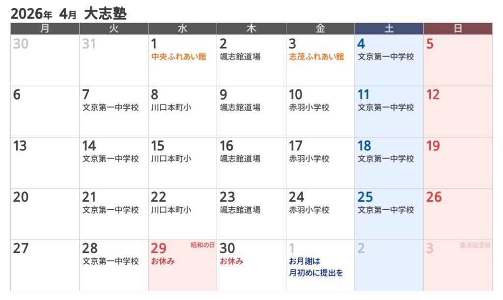 ※ 3月と4月は卒業式・入学式の関係で川口道場赤羽支部の稽古場所に変更があります。ご注意ください。